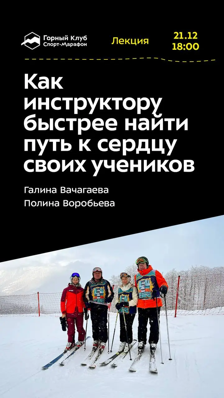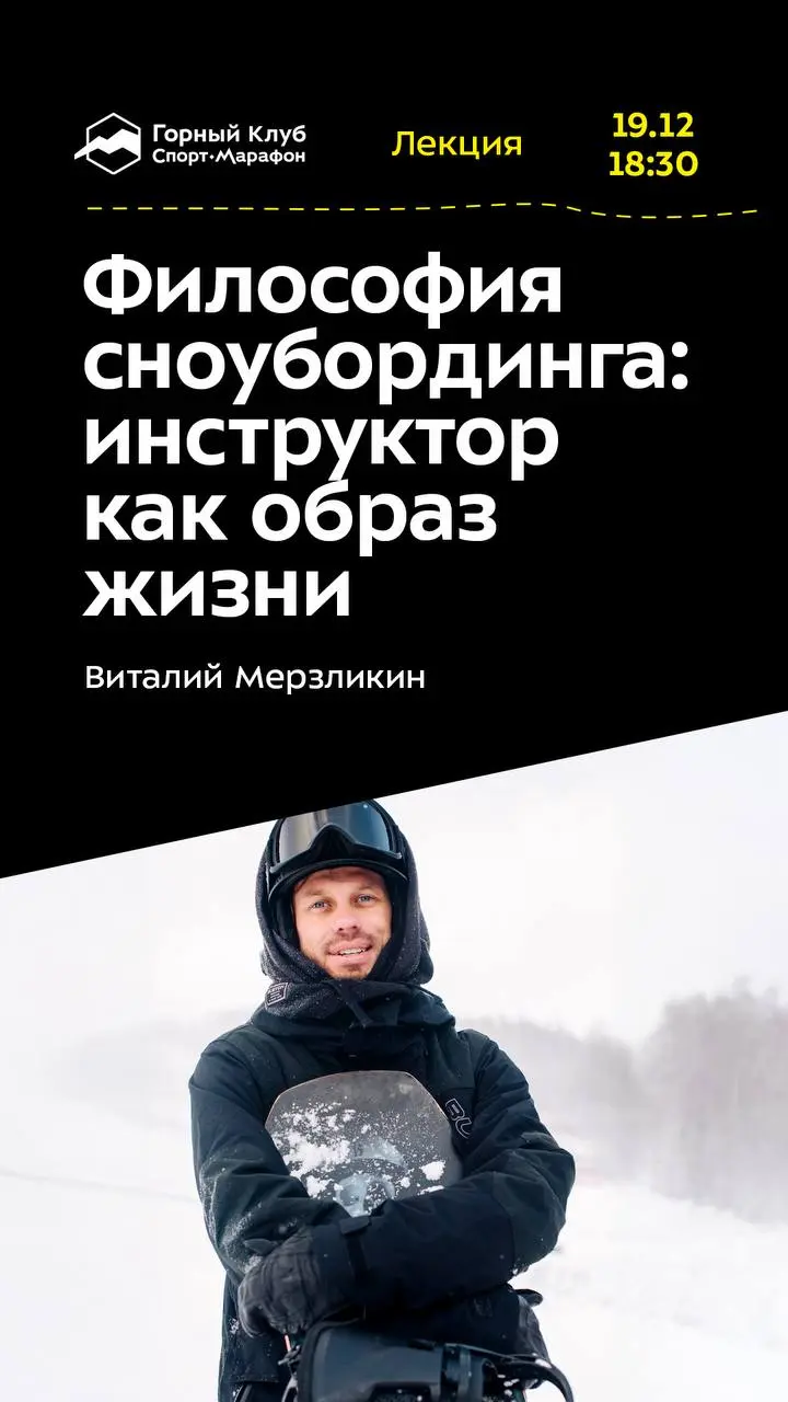 Приглашаем на серию мероприятий в Горном Клубе Спорт-Марафон. В программе представлены лекции, тренировки и просмотр кино. 18 декабря пройдет комплексная тренировка PUMA TRAINING для подготовки к горнолыжному сезону. 19 декабря состоится лекция о философии сноубординга и инструкторской работе. 21 декабря — лекция о работе с учениками. 23 декабря — показ фильма «Obsession» и обсуждение с командой. 24 декабря — новогодняя викторина 🥳. Участие бесплатное. Мероприятия пройдут в Горном Клубе Спорт-Марафон. Узнайте больше в чате мероприятий в телеграм.