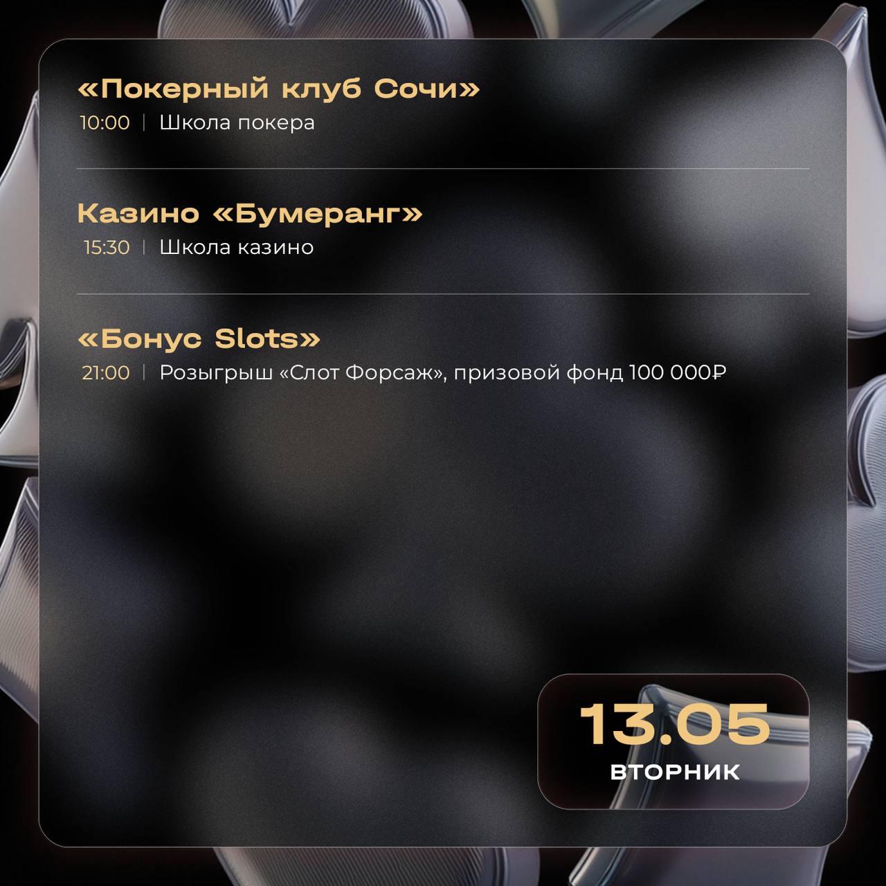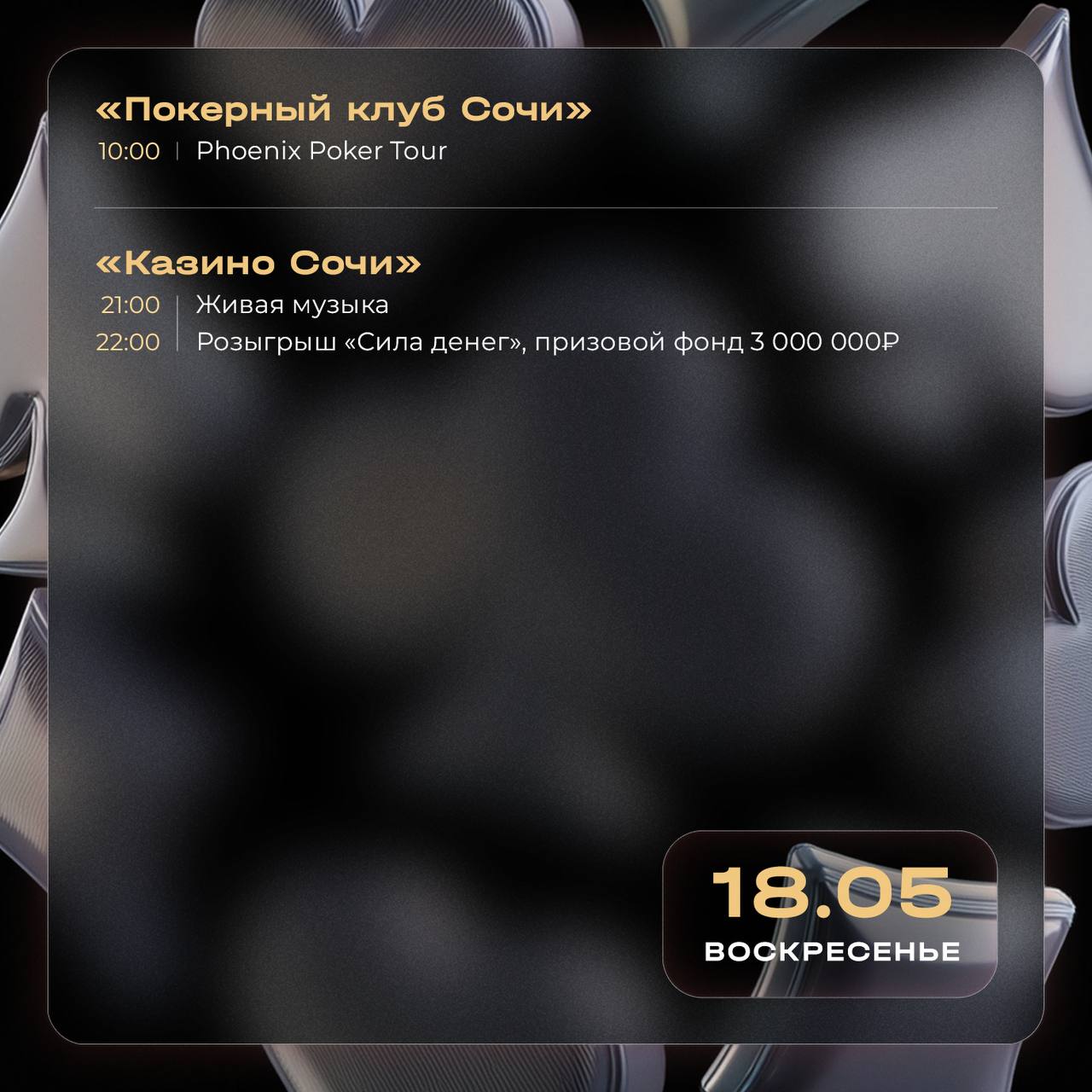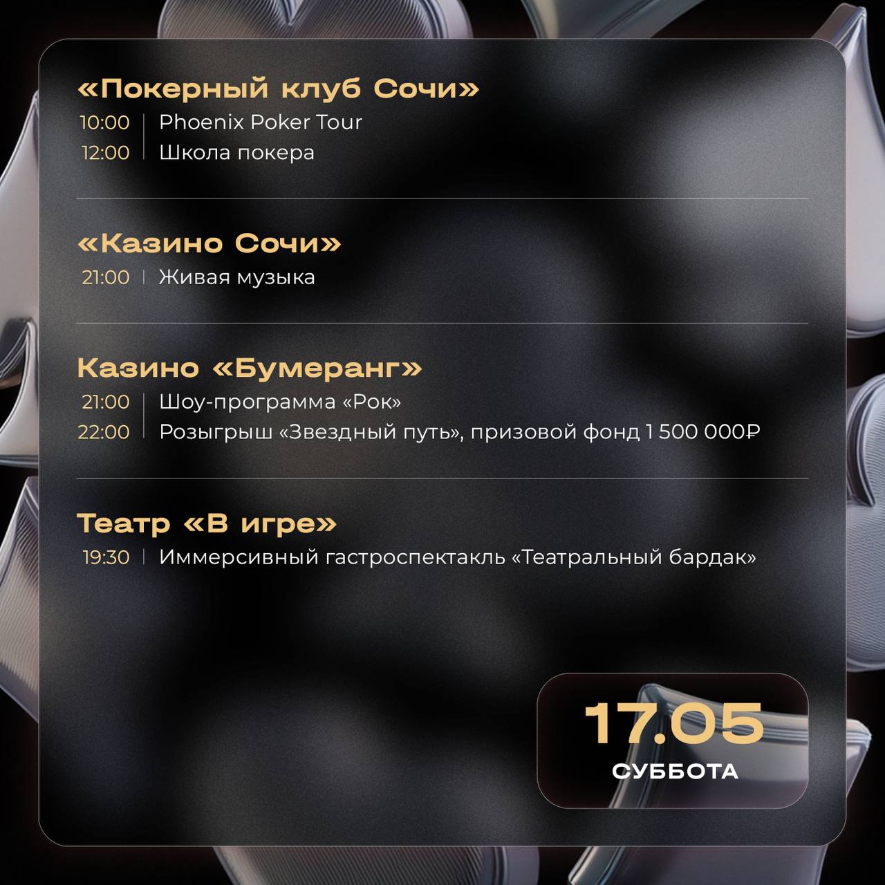 На этой неделе в «Покерном клубе Сочи» стартует Phoenix Poker Tour с шансами на бесплатный ре-ентри в случае вылета. Ещё из нового: иммерсивный гастрономический спектакль «Театральный бардак» — в качестве действующих лиц здесь выступят не только актеры, но и сами зрители.