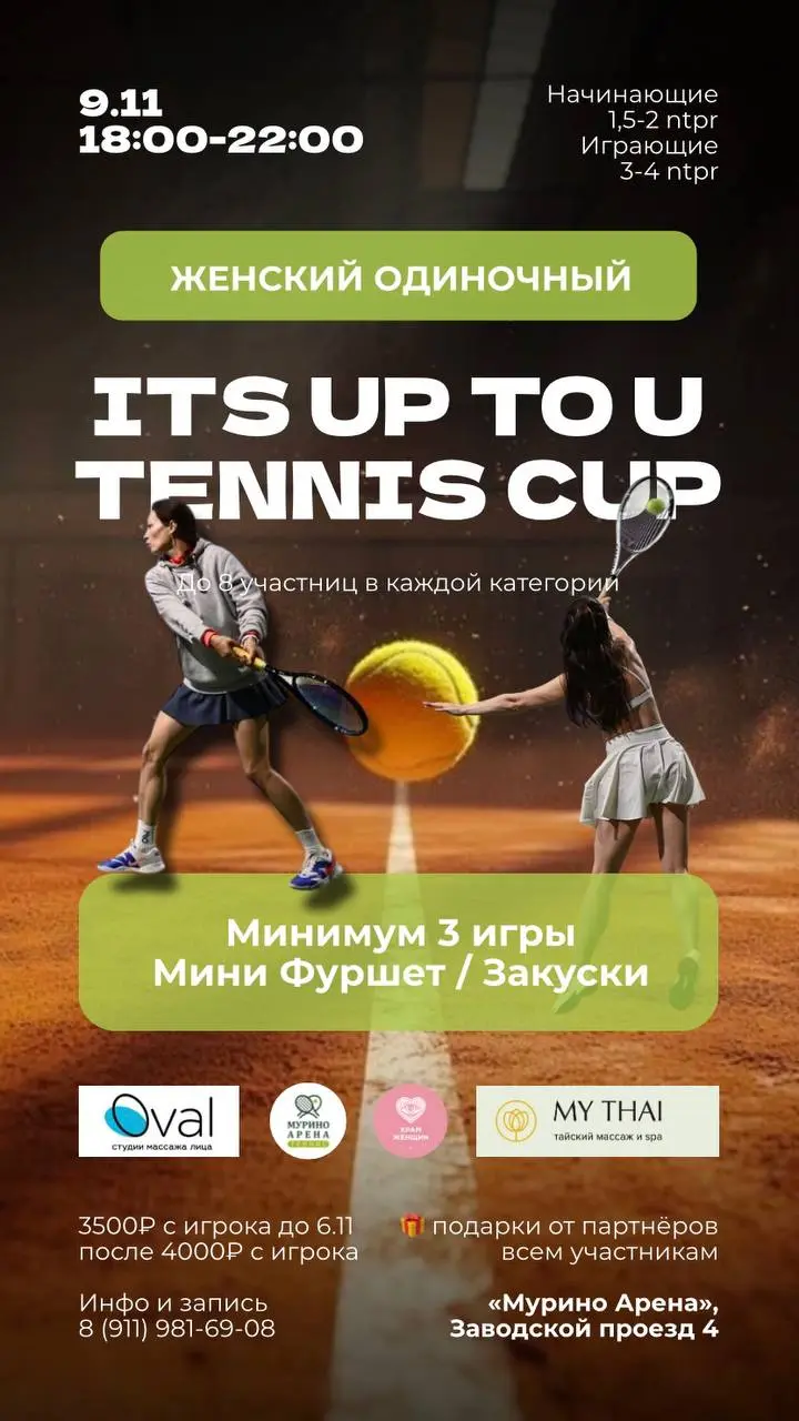 Добрый день! Приглашаем принять участие в турнирах на этой неделе. 8 ноября (суббота) ПСК "Высота" грунт. Одиночный разряд 5 категория Begginers 17:00. 4 категория Rookies 18:00. 9 ноября (воскресенье) ПСК "Высота" грунт. Парный разряд 5 категория Begginers 09:40. Одиночный разряд 2 категория Challenger 12:30. Парный разряд 3 категория Futures 18:00. Текст с прикрепленными фотографиями: ЦАРСКОСЕЛЬСКАЯ ТЕННИСНАЯ ЛИГА ТУРНИР ВЫХОДНОГО ДНЯ 8 НОЯБРЯ ОДИНОЧНЫЙРАЗРЯД 5 КАТ. 17.00 ОДИНОЧНЫЙРАЗРЯД 4 КАТ 18.00 9 НОЯБРЯ ПАРНЫЙРАЗРЯД 5 КАТ 09.40 ОДИНОЧНЫЙРАЗРЯД 2 КАТ 12.30 ПАРНЫЙРАЗРЯД 3 КАТ 18.00; "время может быть изменено организатором"; запись +7 (952) 265-14-89 Алексей.