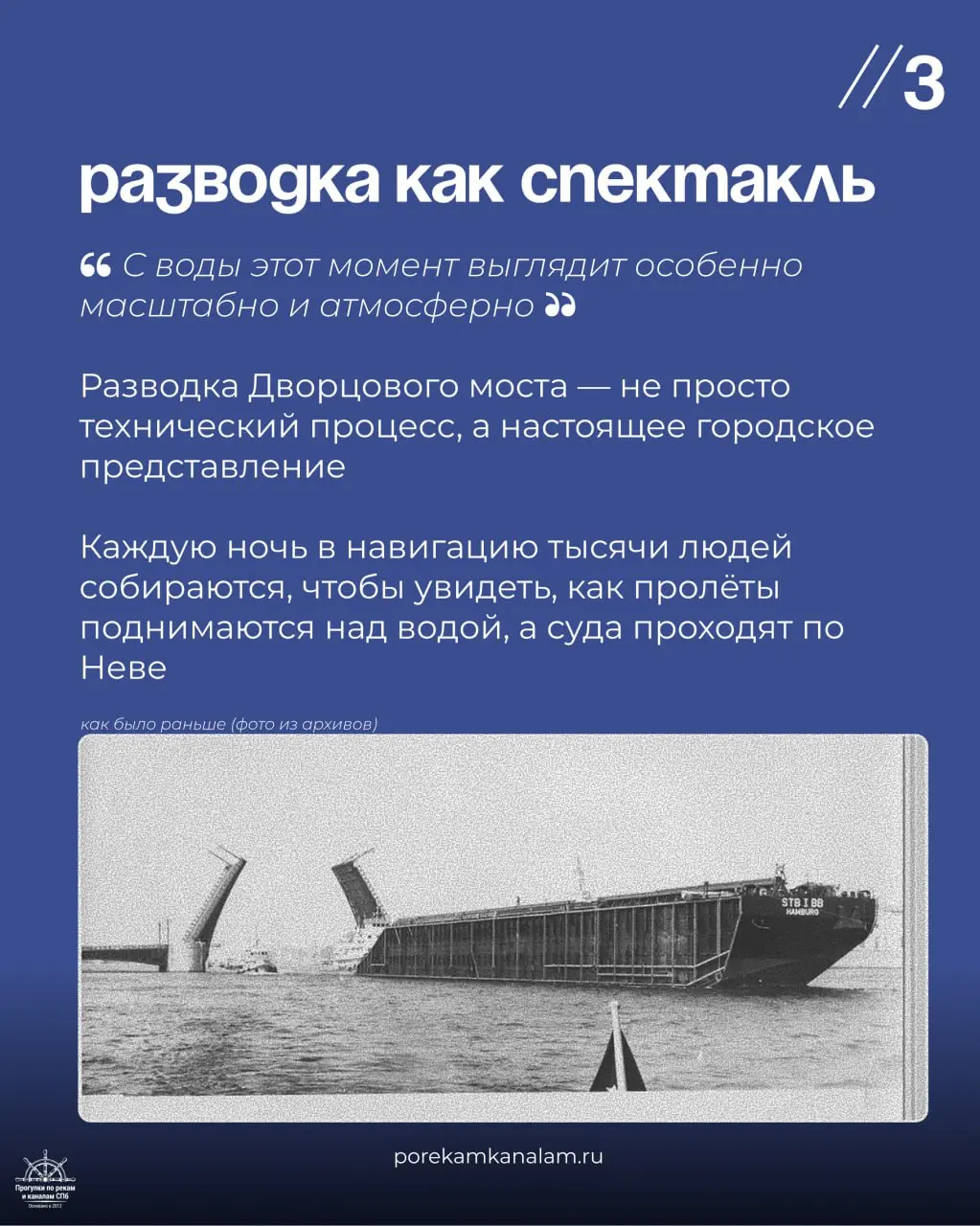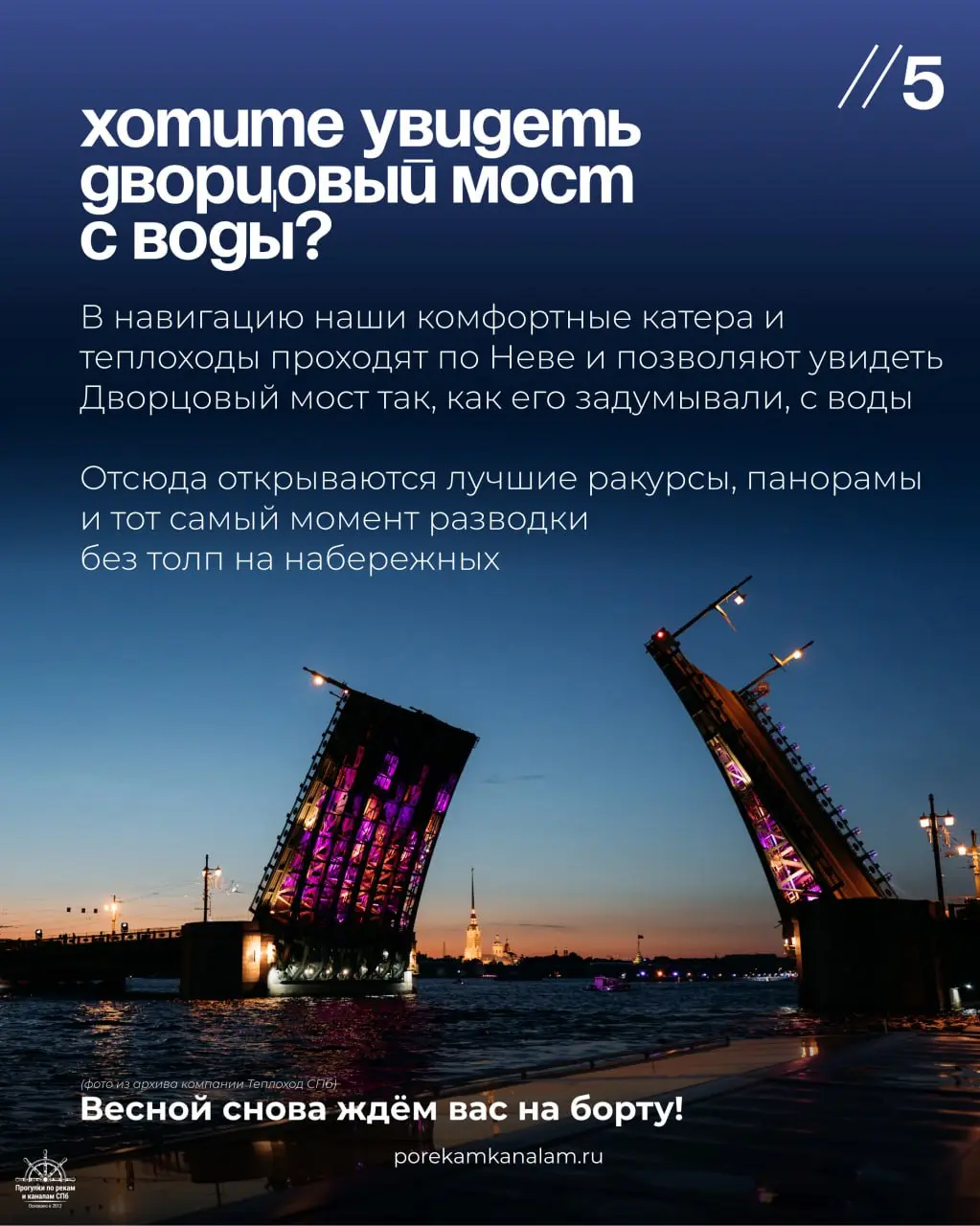 Почувствуйте масштаб и красоту Дворцового моста. Посмотрите на разводку мостов с воды, без толп и суеты. Узнайте об истории Дворцового моста. Вас ждут комфортные катера и теплоходы. 📞 Обсудите детали с менеджерами. 🌐 Подробности на сайте.