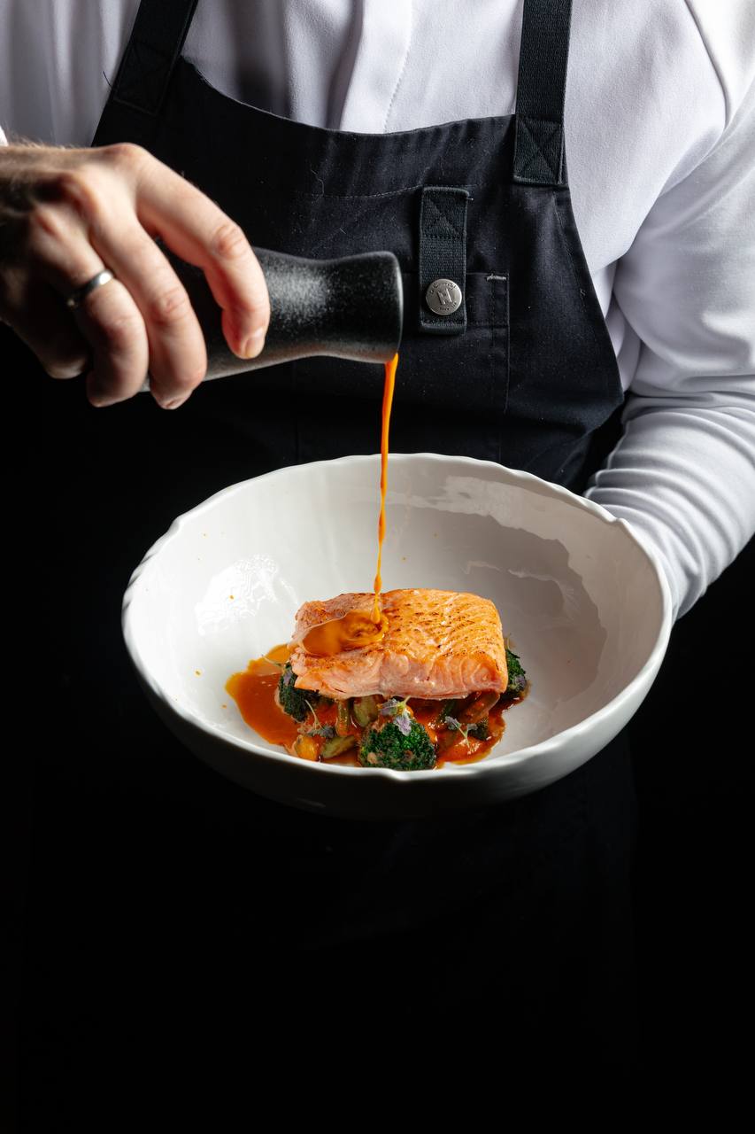 🔸 Лосось с зелеными овощами и соусом том ям — освежающий контраст нежной рыбы с хрустящими овощами