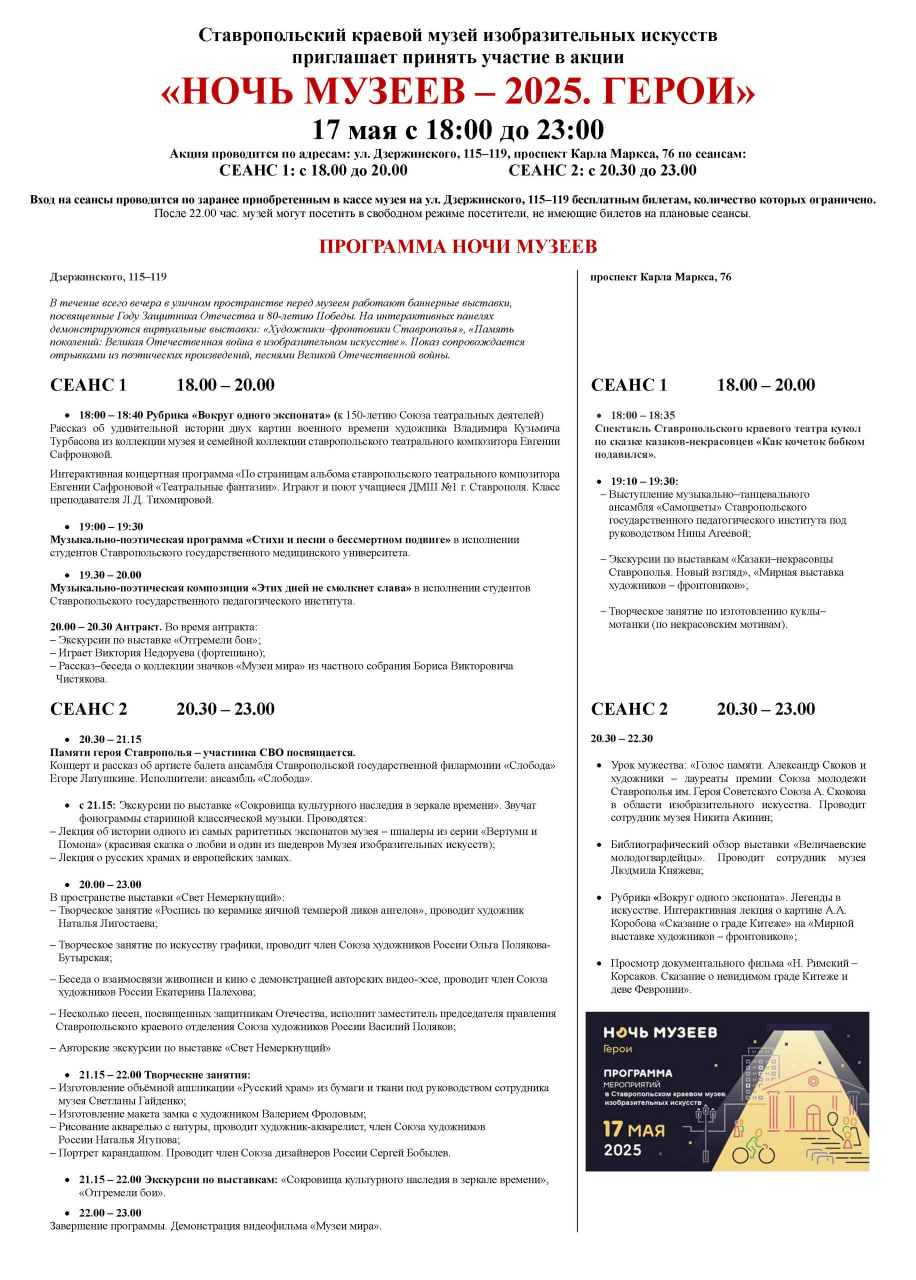 17 мая 2025 года, начало в 18:00 в г. Ставрополь проводится акция «Ночь музеев – 2025. Герои» в Ставропольском краевом музее изобразительных искусств. Мероприятие делится на два сеанса: первый с 18:00 до 20:00, второй с 20:30 до 23:00. Мероприятие пройдет по адресам: ул. Дзержинского, 115–119 и проспект Карла Маркса, 76. Для справок по телефону: 8(8652) 23-01-82.
