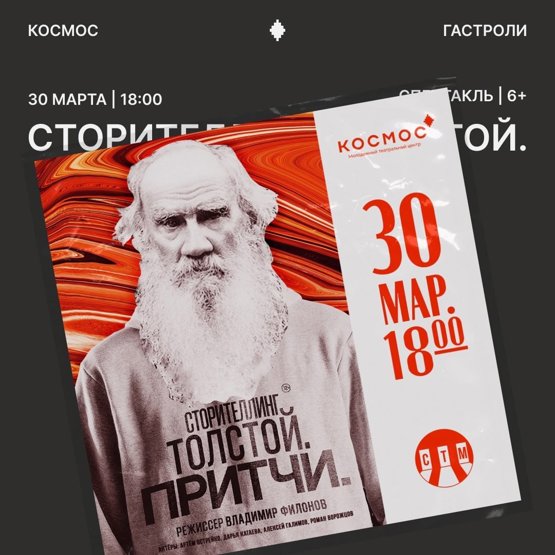 Спектакль, где актеры доказывают, что Толстой не только классик, но и свой в доску парень. Он как никто чувствовал и понимал насущные проблемы и умел доносить их своим творчеством. Приходи и получи его мудрость в легкой и простой манере.