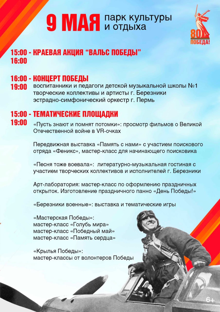 Встречаемся в парке 9 мая, в День Победы, чтобы отметить праздник Победы советского народа в Великой Отечественной войне. В программе: концертная программа 'Во славу Победы', детская игровая зона, площадка 'Фронтовая песня', мастер-классы 'Танк', 'Лампадка', 'Письмо мира', настольные и напольные игры, квест 'Патриот', спортивная площадка 'Полоса препятствий' и другие activités. Также запланирована встреча в парке культуры и отдыха с концертом и валсом Победы в 15:00, а в 16:00 и далее выступления музыкальных коллективов и оркестра.