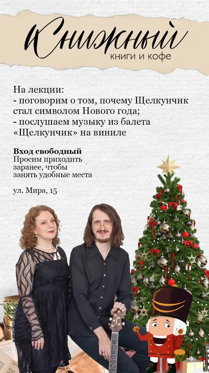 Приходите в "Книжный" на лекцию "Волшебство "Щелкунчика"" от Артёма Березуцкого и Дарьи Махмудовой. Вы узнаете, почему "Щелкунчик" стал символом Нового года. Будет возможность послушать музыку из балета на виниле 🎧. Мероприятие бесплатное, приглашаем всех желающих.